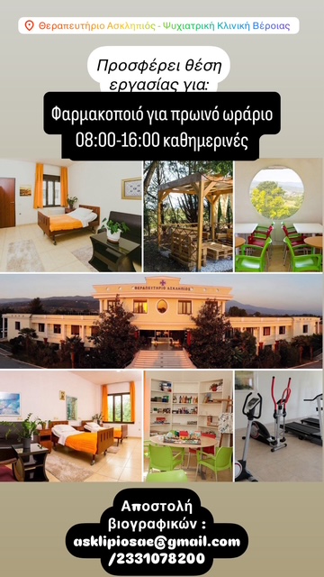 📍Το Θεραπευτήριο Ασκληπιός ψυχιατρική κλινική Βέροιας αναζητά φαρμακοποιό 8ωρη εργασία πρωινή καθημερινές, για ενίσχυση της ομάδας του.